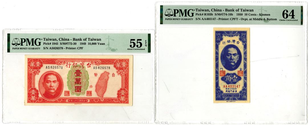 Taiwan, China. 1949-50. 2 Issued banknotes: 10,000 Yuan, P-1945, S/M#T72-30, Red on multicolor underprint, S/N AS826578, PMG graded About Uncirculated 55 EPQ; and 10 Cents - Kinmen, P-R103b S/M#T74-10b, Blue, S/N AA403147, PMG graded Choice Uncirculated 64. (2)