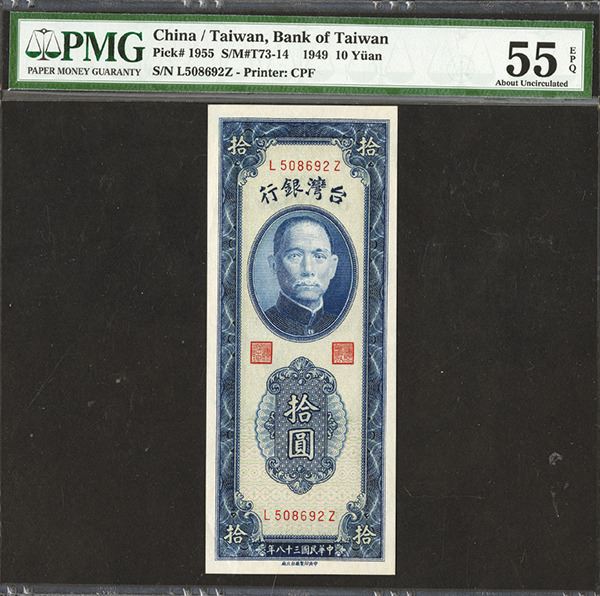 Taiwan, China. 10 Yuan, P-1955 S/M#T73-14, Issued banknote, Blue on m/c underprint, SYS top center, back blue, Vertical format, PMG graded About Uncirculated 55 EPQ condition. Attractive banknote. CPF.