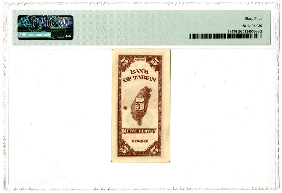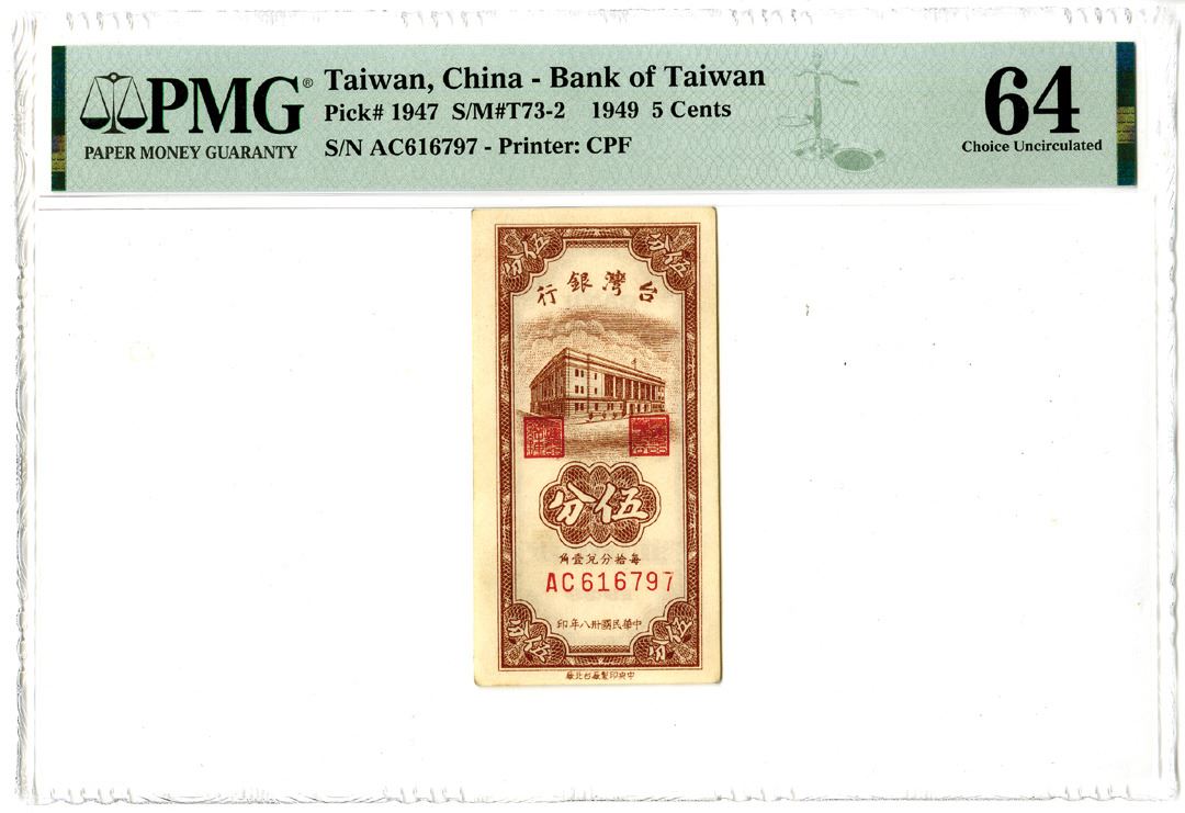 Taiwan, China, 1949. 5 Cents, P-1947 S/M#T73-2, Issued Banknote. Brown with red signatures in vertical format with bank building on face and map of Taiwan on the back. S/N AC616797. Printer: CPF. PMG graded Choice Uncirculated 64.