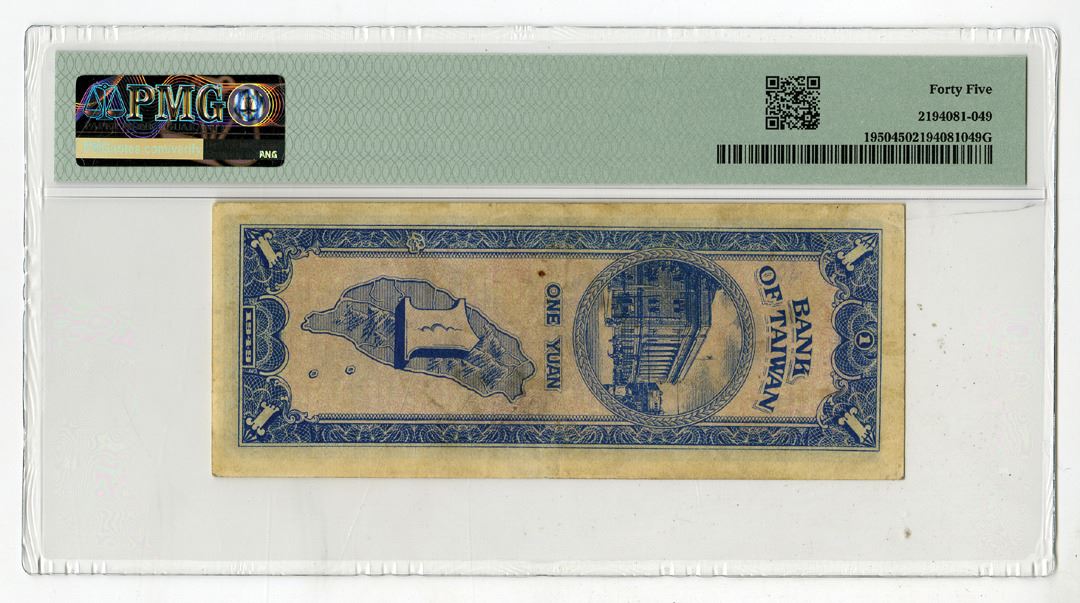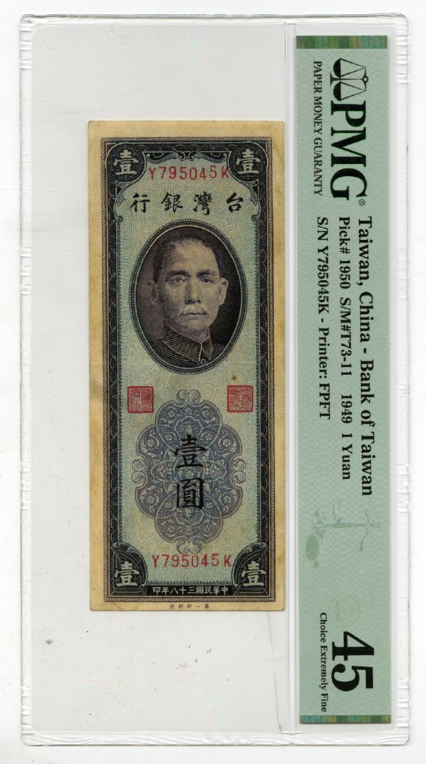 Taiwan, 1949, 1 Yuan, P-1950 S/M#T73-11, Issued Banknote, Dark blue on light blue underprint, SYS on top middle of face, Back blue on pale red underprint with bank at center, S/N Y795045K, PMG graded Choice Extremely Fine 45, FPFT