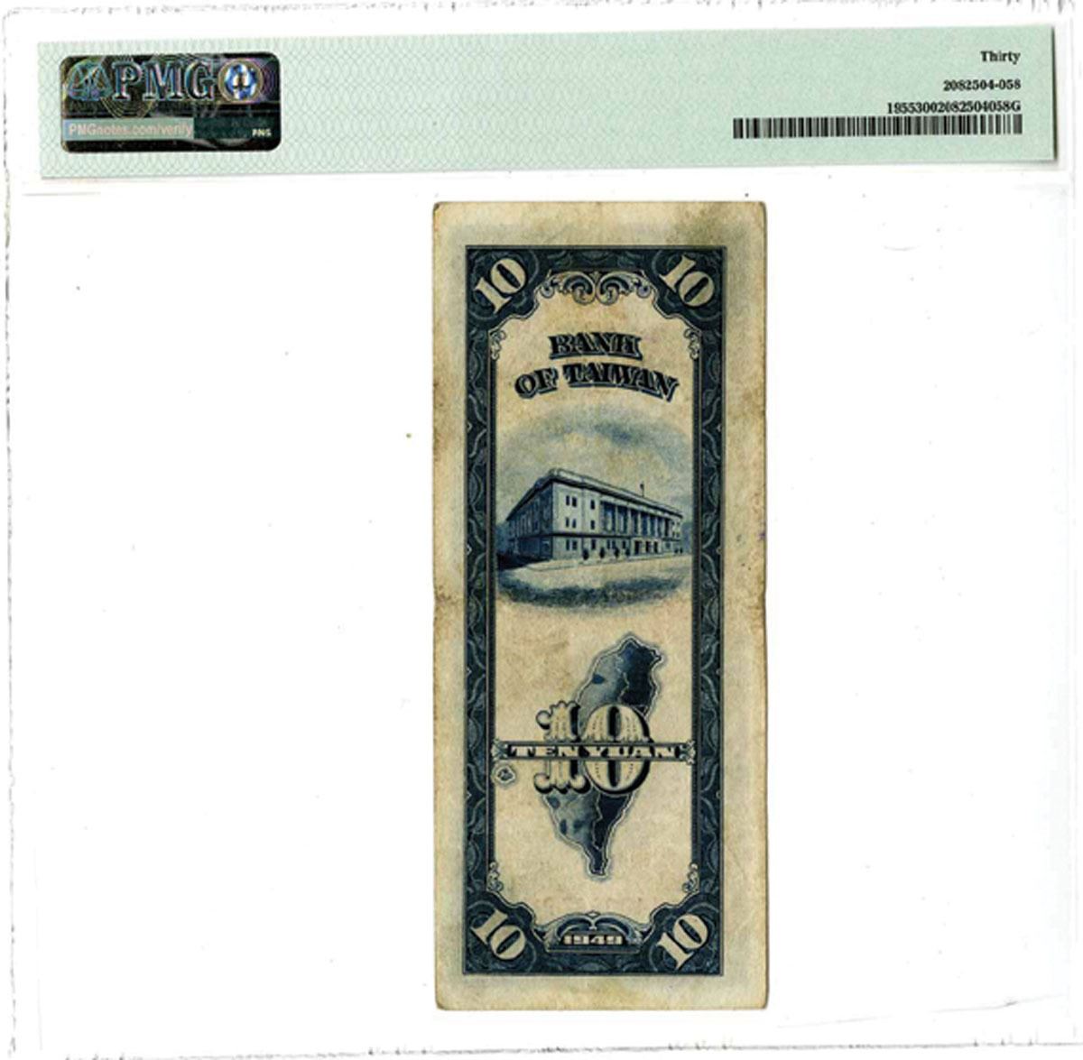 China - Taiwan, 1949. 10 Yuan, P-1955, S/M#T73-14, Issued Banknote, Blue on m/c underprint with SYS at center in vertical format, S/N J406897P, Printer: CPF, PMG graded Very Fine 30.