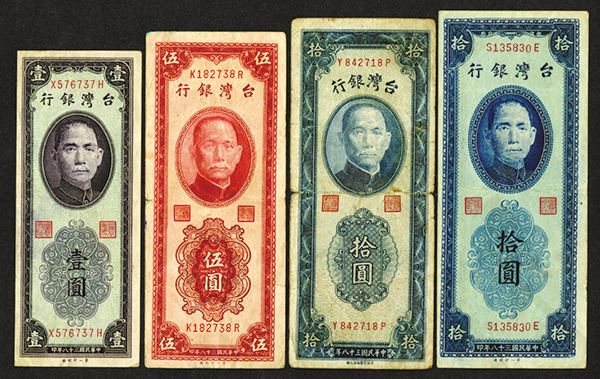 China, Taiwan. 1, 5, 10 Yuan. P-1950; 1953; 1954; 1955 (Fine). S/M T73-11; 12; 14; 15. SYS at top on all. Very Fine or so. The blue 10 Yuan is a key to the group. 4 pieces.