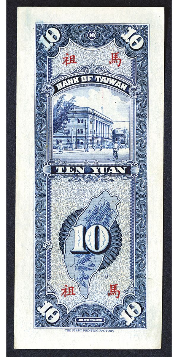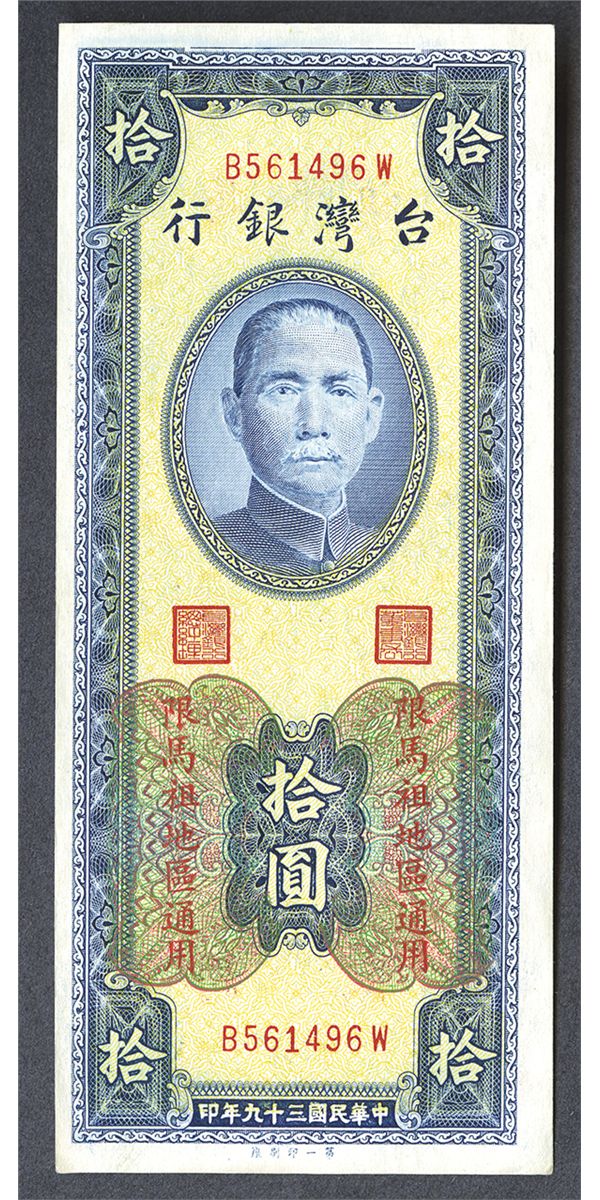 Taiwan, China. 1950 (1952), 10 Yuan, P-R143 S/M#T76-20, Issued banknote, Blue on light yellow underprint, SYS top center, back blue, Vertical format, 7 Chinese character overprint left and right vertically flanking denomination. S/N B561496W, AU condition with one light horizontal fold keeping this lovely note from Uncirculated to CU condition. Scarce Tachen branch issue rarely seen this nice. There has been only one note previously graded in the PMG census. FPFT
