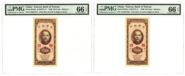 Taiwan, China. Lot of 2 sequential 1950 (1952) notes, 50 cents, P-R104b S/M#T74-11, Issued banknotes, Brown on light orange red undertint on face, SYS top center, back brown, Vertical format, "Chin Men" overprint on left and right on Face and back. Sequential S/N's AA 827186 to AA 827187, Both are PMG graded Gem Uncirculated 66 EPQ. Rare high grade banknote pair. CPF.