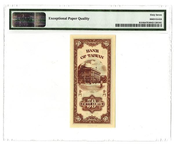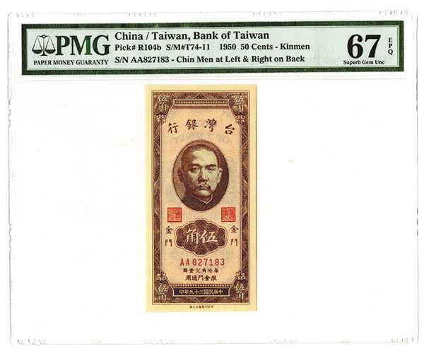 Taiwan, China. 1950 (1952), 50 cents, P-R104b S/M#T74-11, Issued banknote, Brown on light orange red undertint on face, SYS top center, back brown, Vertical format, "Chin Men" overprint on left and right on Face and back. S/N AA 827183, PMG graded Superb Gem Uncirculated 67 EPQ. Tied with Finest Known in the PMG census. CPF.