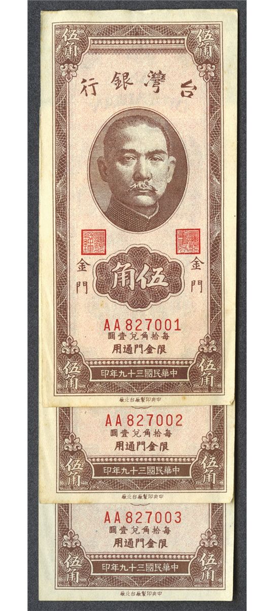 Taiwan, China. Lot of 3 notes. All are sequential 1950 (1952) notes, 50 cents, P-R104b S/M#T74-11, Issued banknotes, Brown on light orange red undertint on face, SYS top center, back brown, Vertical format, "Chin Men" overprint on left and right on back. Sequential S/N's AA 827001 to AA 827003, All would grade Choice XF to AU. Attractive banknote trio. CPF.