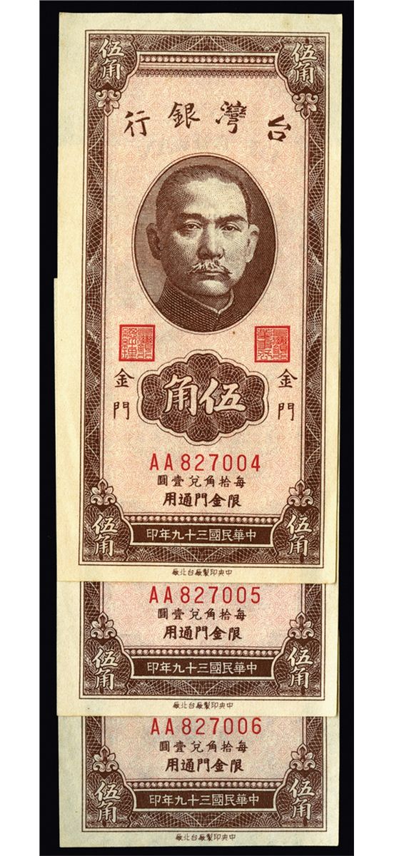 Taiwan, China. Lot of 3 notes. All are sequential 1950 (1952) notes, 50 cents, P-R104b S/M#T74-11, Issued banknotes, Brown on light orange red undertint on face, SYS top center, back brown, Vertical format, "Chin Men" overprint on left and right on back. Sequential S/N's AA 827004 to AA 827006, All would grade AU to Choice AU. Attractive banknote trio. CPF.