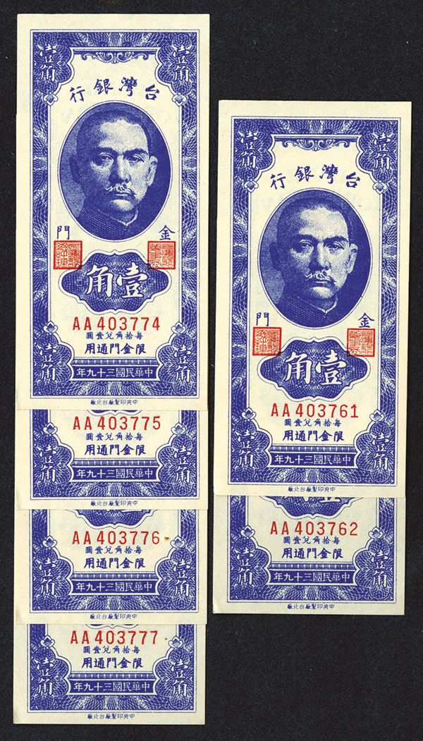Taiwan, China. Lot of 6 sequential notes. All are 1950 (1952) notes, 10 cents, P-R103b S/M#T74-10b, Issued banknotes, Blue face, SYS top center, back blue, Vertical format, "Chin Men" overprint at middle and bottom of note on face. Sequential S/N's AA403761 and AA403762; AA 403774 to AA 403777, The notes grade Choice AU with a very small lower left corner tip jam keeping these lovely notes from Unc. to CU. Attractive banknotes. CPF.