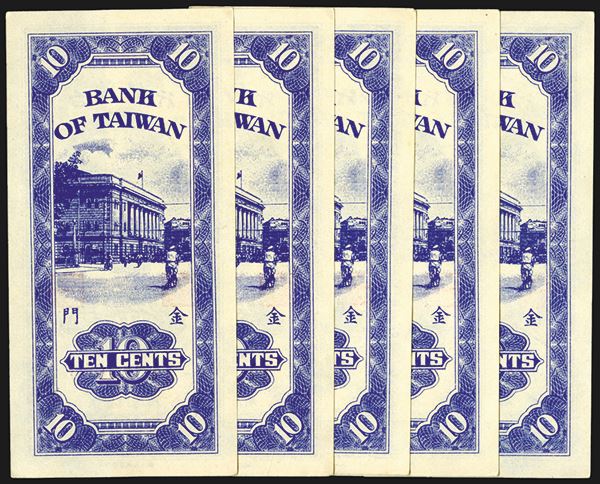Taiwan, China. Lot of 5 notes. All are 1950 (1952) notes, 10 cents, P-R103b S/M#T74-10b, Issued banknotes, Blue face, SYS top center, back blue, Vertical format, "Chin Men" overprint at middle and bottom of note on face. All appear Uncirculated. Attractive banknotes. CPF.
