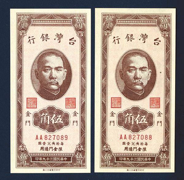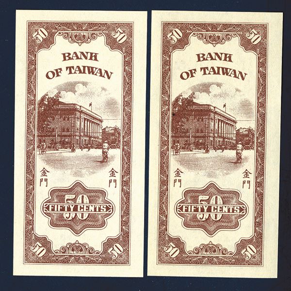 Taiwan, China. Lot of 2 notes. Both are 1950 (1952) notes, 50 cents, P-R104b S/M#T74-11, Issued banknotes, Brown on light orange red undertint on face, SYS top center, back brown, Vertical format, "Chin Men" overprint on left and right on back. Sequential S/N's AA 827088 & AA 827089, Both would grade Choice to Gem Uncirculated. Attractive banknotes. CPF.