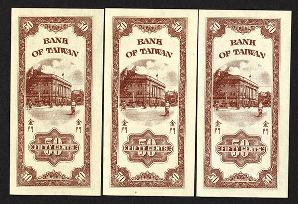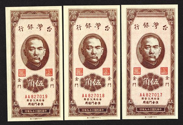 Taiwan, China. Lot of 3 notes. 2 are sequential 1950 (1952) notes, 50 cents, P-R104b S/M#T74-11, Issued banknotes, Brown on light orange red undertint on face, SYS top center, back brown, Vertical format, "Chin Men" overprint on left and right on back. Sequential S/N's AA 827017 to AA 827019, All grade Choice to Gem Uncirculated. Attractive banknote trio. CPF.