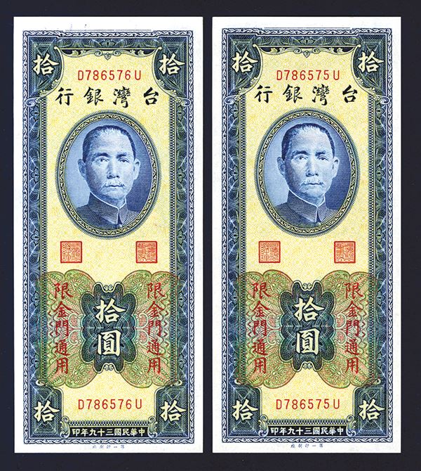 Taiwan, China. Lot of 2 notes, Sequential pair, 1950 (1952), 10 Yuan, Issued banknote, Blue on light yellow underprint, SYS top center, back blue, Vertical format, 5 Chinese character overprint left and right vertically flanking denomination. S/N D786575U - D786576U, Both appear Choice Uncirculated but both, have very light small corner tip bends leaving them Choice AU-Unc. FPFT - The First Printing Factory.