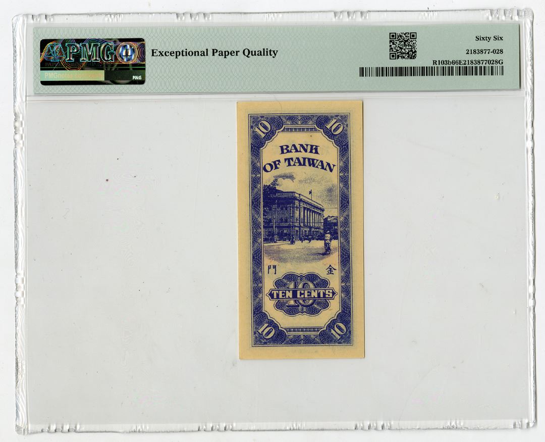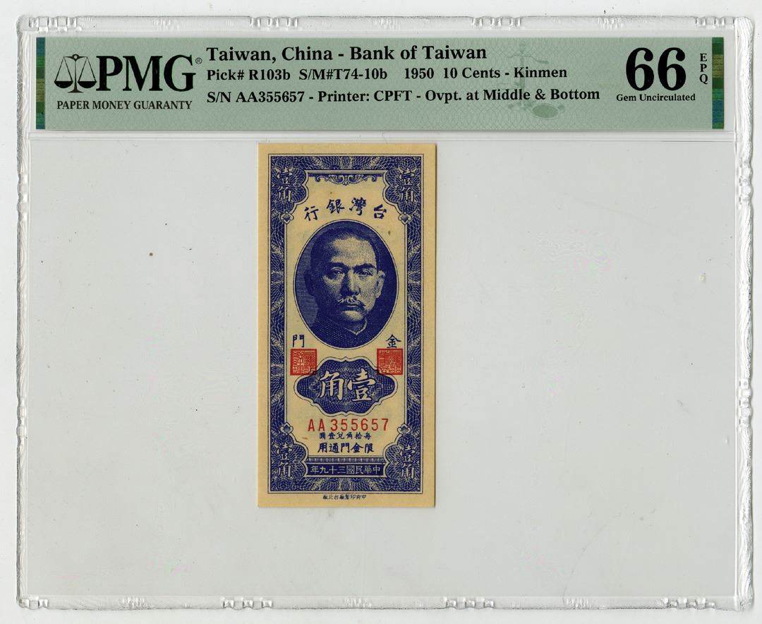 Taiwan, China, 1950. 10 Cents - Kinmen, P-R103b, S/M#T74-10b, Issued Banknote, Blue printing in Vertical format, SYS at top center, back blue with bank building, S/N AA355657, PMG graded Gem Uncirculated 66 EPQ, CPFT. Only 3 notes grade higher out of 334 graded in the PMG census.