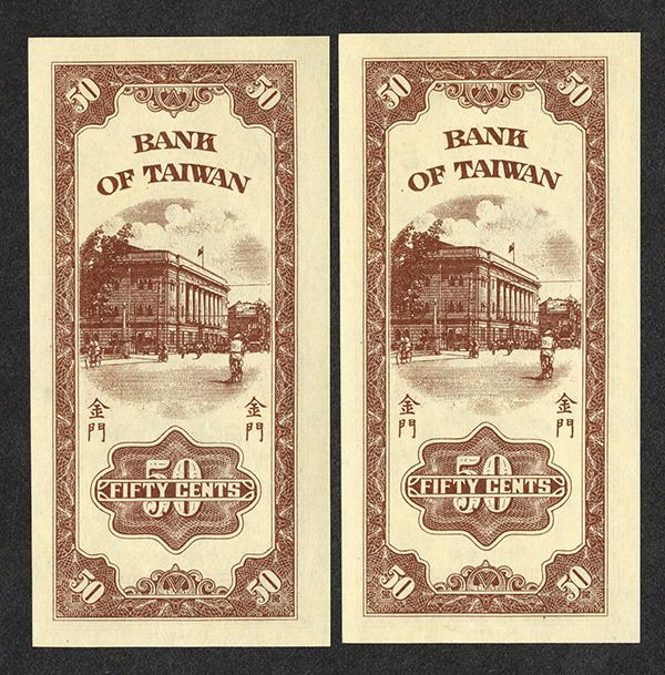 Kinmen, Taiwan, Lot of two sequential banknotes, both are Issued 50 Cents, P-R104b (S/M#T74-11), brown on pink underprint with SYS in middle, back with bank building, S/N's AA 827066 & 67, both appear Gem Uncirculated, attractive and high grade sequential pair.