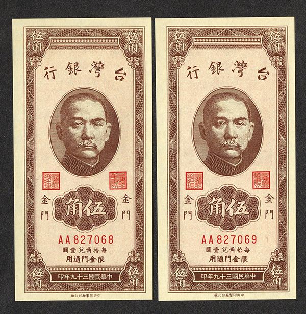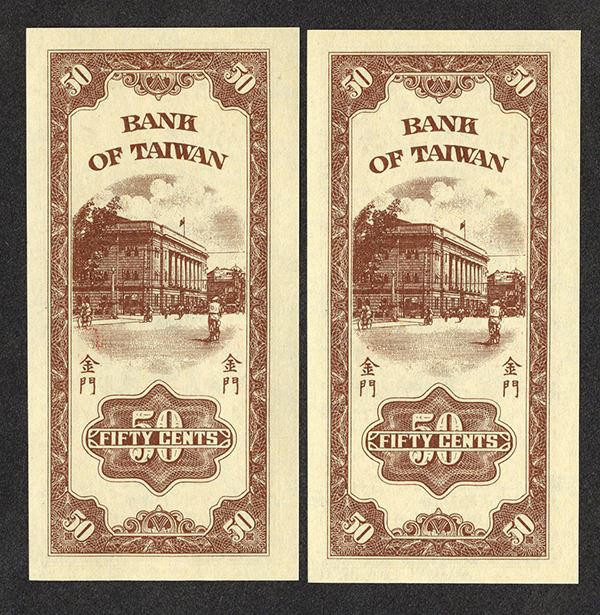 Kinmen, Taiwan, Lot of two sequential banknotes, both are Issued 50 Cents, P-R104b (S/M#T74-11), brown on pink underprint with SYS in middle, back with bank building, S/N's AA 827068 & 69, both appear Gem Uncirculated, attractive and high grade sequential pair.