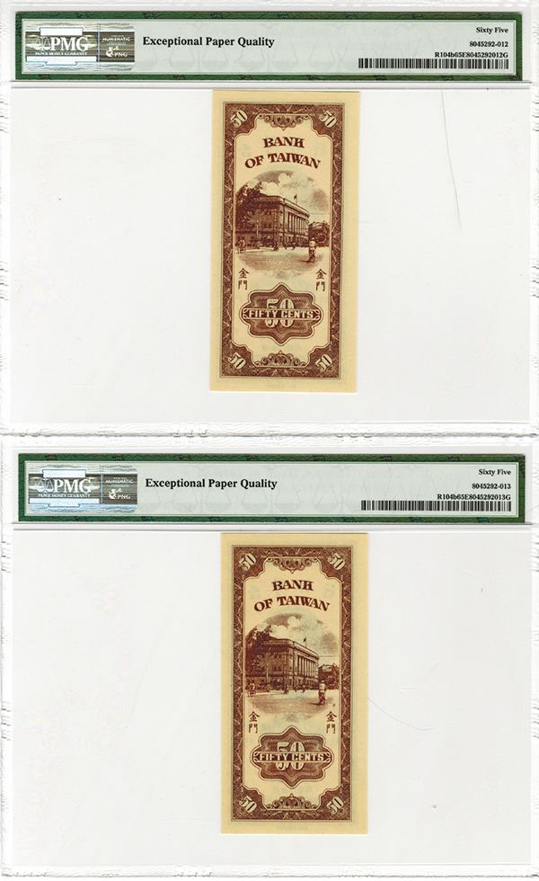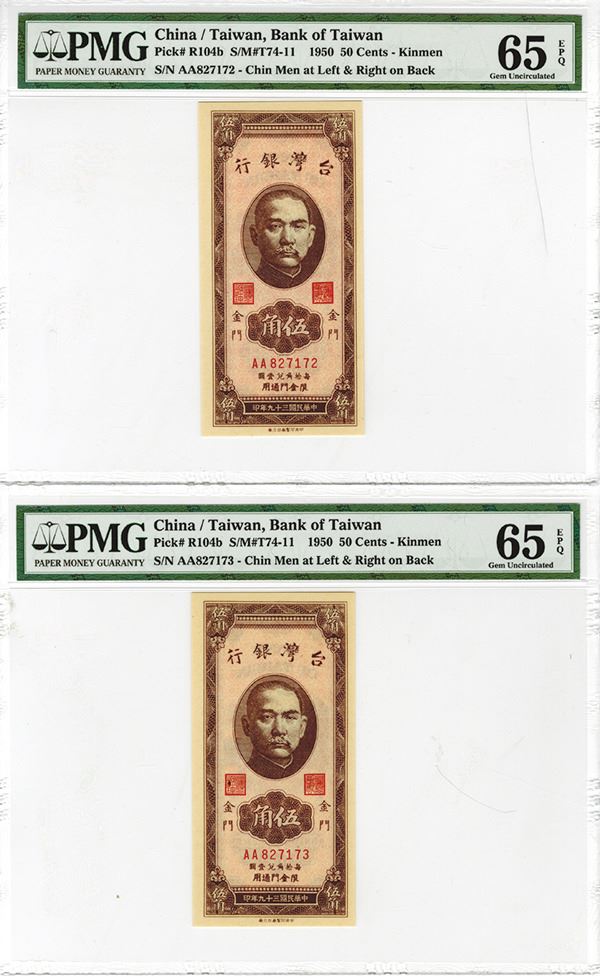Kinmen, Taiwan, Lot of two sequential banknotes, both are Issued 50 Cents, P-R104b (S/M#T74-11), brown on pink underprint with SYS in middle, back with bank building, S/N's AA 827172 & 73, both are PMG graded Gem Uncirculated 65 EPQ, attractive and high grade sequential pair.