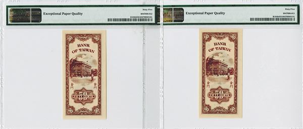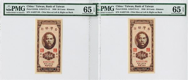 Kinmen, Taiwan, Lot of 2 sequential banknotes, 50 Cents, P-R104b (S/M#T74-11), brown on pink underprint with SYS in middle, back with bank building, S/N's AA 827148 and 827149, Both are PMG graded Gem Uncirculated 65 EPQ, attractive and high grade pair.