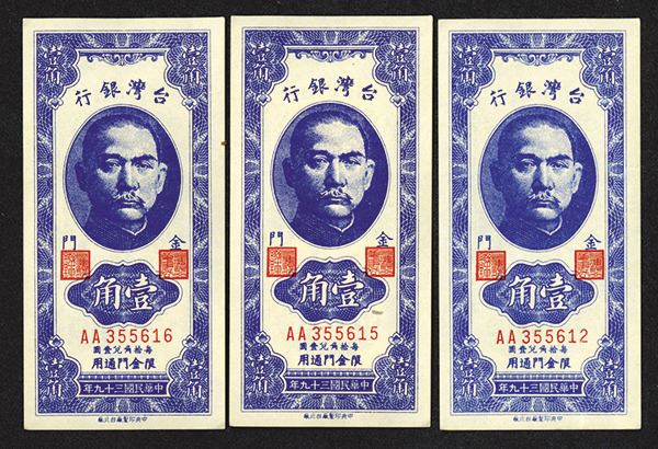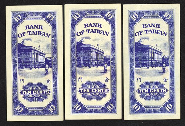 Kinmen, Taiwan, Lot of 3 banknotes, All are Issued 10 Cents, P-R103b (S/M#T74-10b), Blue with SYS in middle, back with bank building, S/N's AA 355615 and 355616, AU to Uncirculated.