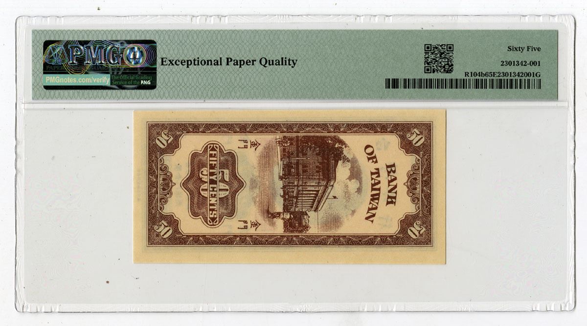 Kinmen, Taiwan, 1950. 50 Cents, P-R104b S/M#T74-11, Issued Banknote, Brown on pink underprint in Vertical format with SYS at center, Back is brown with building at center, S/N AA827051, PMG graded Gem Uncirculated 65 EPQ, CPFT.