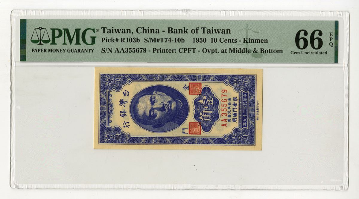 Kinman, Taiwan, China, 1950. 10 Cents, P-103b S/M#T74-10b, Issued Banknote, Blue printing with SYS at center, Note in Vertical format, S/N AA355679, PMG graded Gem Uncirculated 66 EPQ, CPFT.