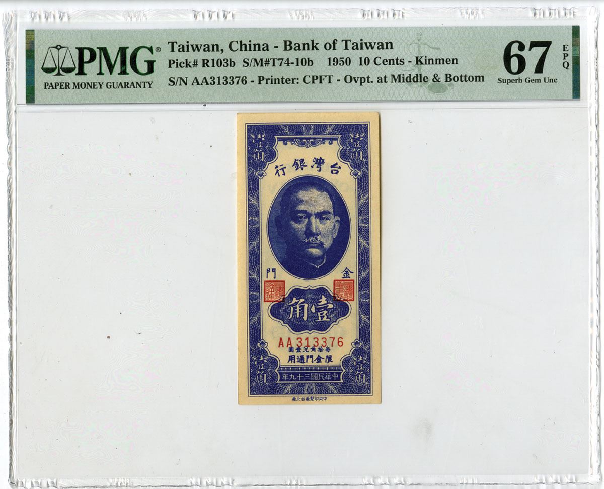 China - Taiwan, 1950. 10 Cents, P-103b S/M#T74-10b, Issued Banknote, Blue printing with SYS at center, Note in Vertical format, S/N AA313376, PMG graded Superb Gem Uncirculated 67 EPQ, CPFT. Tied with 5 other notes as highest graded in the PMG census out of 405 previously graded. No notes graded "67" have been offered at auction previously.