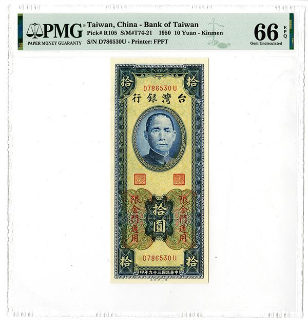 China - Taiwan. 1950, 10 Yuan. P-R105. S/M# T74-21. SYS at top center. Blue on yellow and m/c, Back blue, PMG graded Gem Uncirculated 66 EPQ. FPFT.