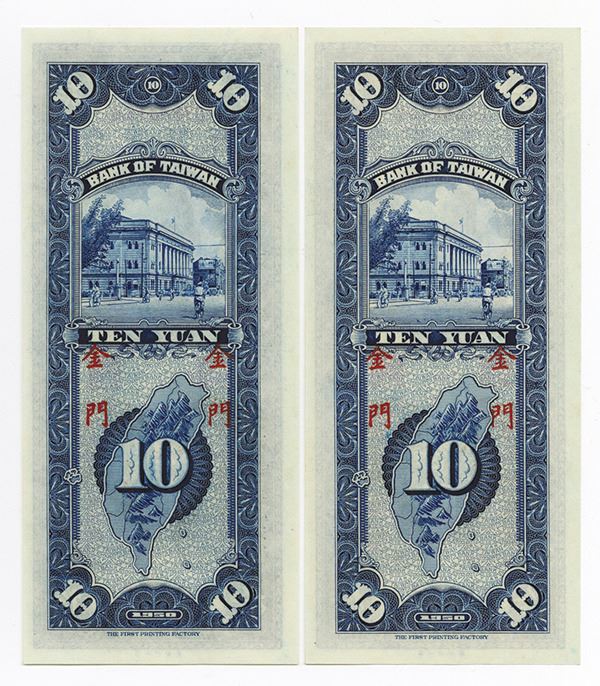 Taiwan, China. Lot of 2 sequential notes, both are 10 Yuan, P-R105, S/M#T74-21, Issued banknote, Sequential banknote pair, S/N's D786545 U - 546 U, Both are in CU to Gem Uncirculated condition or better, both with large margins, sharp corners. FPFT.