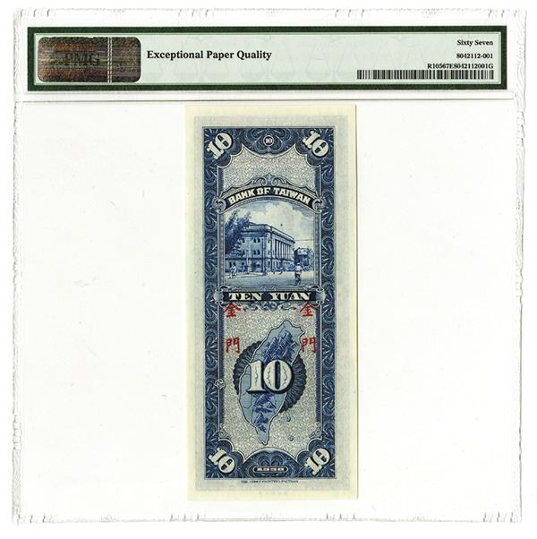 Taiwan, China. 1950, 10 Yuan, P-R105, S/M#T74-21, Issued banknote, Blue on yellow and m/c underprint, SYS at top, back blue with bank building, S/N D786563U, PMG graded Superb Gem Uncirculated 67 EPQ. FPFT. Tied with Finest Known in the PMG census.