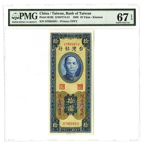 Taiwan, China. 1950, 10 Yuan, P-R105, S/M#T74-21, Issued banknote, Blue on yellow and m/c underprint, SYS at top, back blue with bank building, S/N D786563U, PMG graded Superb Gem Uncirculated 67 EPQ. FPFT. Tied with Finest Known in the PMG census.