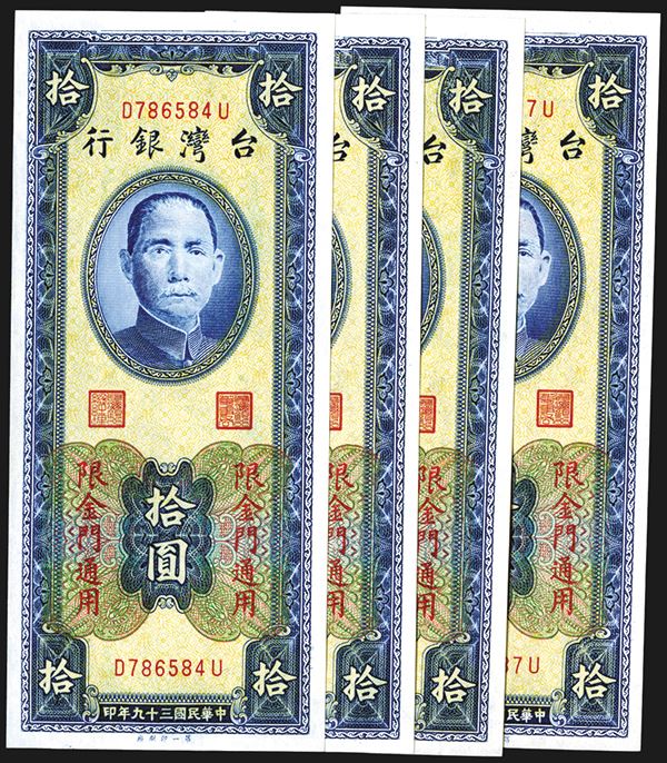 Taiwan, China. Lot of 4 notes. All are 1950 (1952), 10 Yuan, P-R1105 S/M#T74-21, Issued banknotes, Blue on light yellow underprint, SYS top center, back blue, Vertical format, 5 Chinese character overprint left and right vertically flanking denomination. S/N D786584U to D786587U, Uncirculated to Choice Uncirculated. FPFT