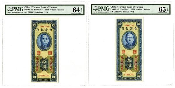 Taiwan, China. Lot of 2 high grade sequential notes, both are 1950, 10 Yuan, P-R105, S/M#T74-21, Issued banknotes, Blue on yellow and m/c underprint, SYS at top, back blue with bank building, sequential pair, S/N's D786570U and D786571U, PMG graded Gem Uncirculated 65 EPQ and Choice Uncirculated 64 EPQ, both with large even margins, sharp corners. FPFT.