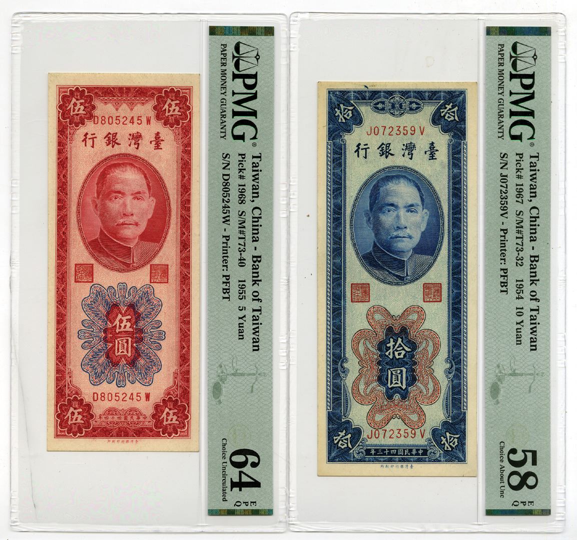 Taiwan, 1954-55. Lot of 2 Issued Banknotes, Includes: 10 Yuan, P-1967, S/M#T73-32, Issued Banknote, Blue on m/c underprint with portrait of SYS at top in vertical format, S/N J072359V, PMG graded Choice About Uncirculated 58 EPQ; 5 Yuan, P-1968, S/M#T73-40, Issued Banknote, Red on m/c underprint with portrait of SYS at top in vertical format, S/N D805245W, PMG graded Choice Uncirculated 64 EPQ. Both notes were printed by PFBT. (2). Sold "AS IS" no returns accepted.