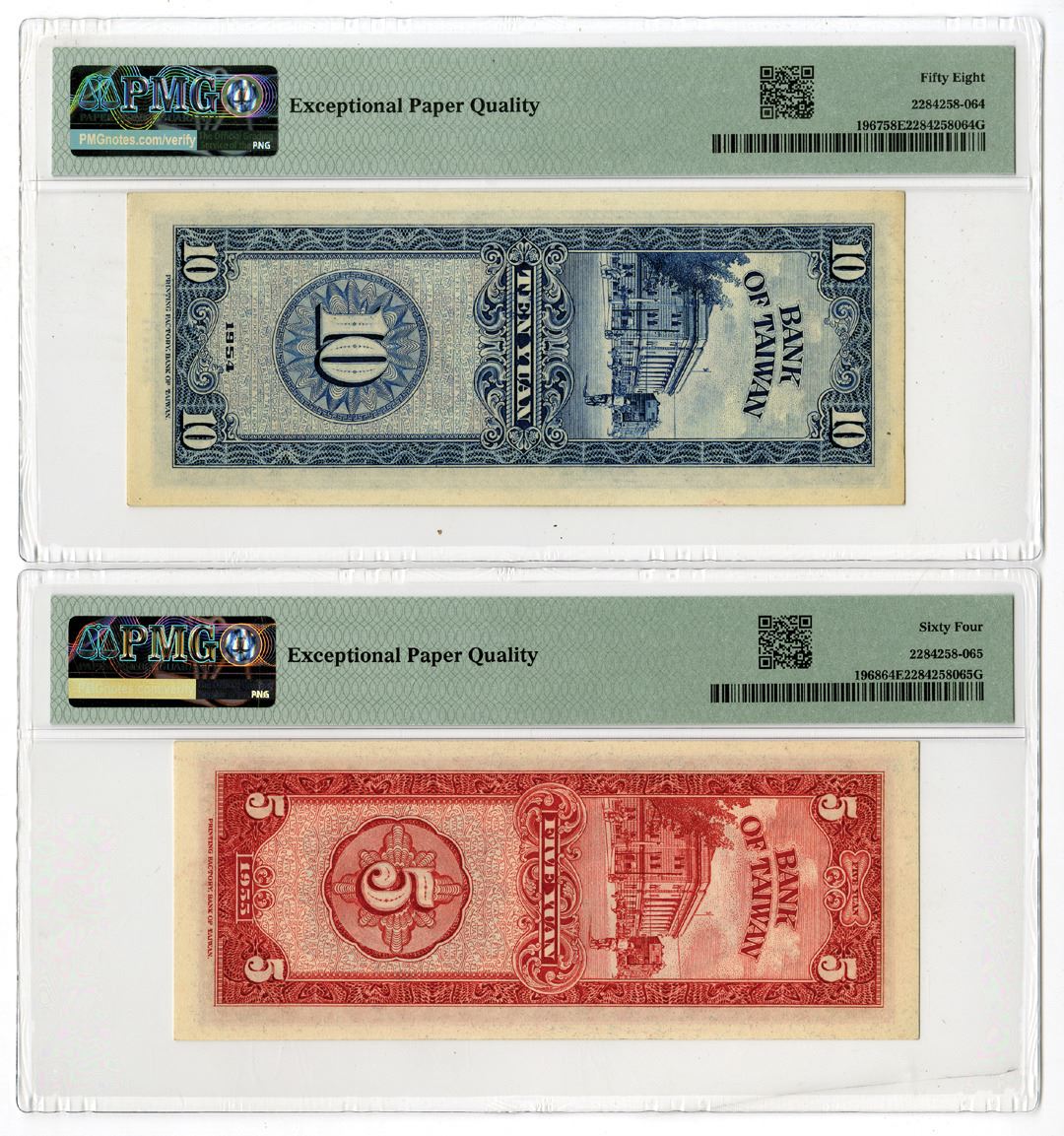 Taiwan, 1954-55. Lot of 2 Issued Banknotes, Includes: 10 Yuan, P-1967, S/M#T73-32, Issued Banknote, Blue on m/c underprint with portrait of SYS at top in vertical format, S/N J072359V, PMG graded Choice About Uncirculated 58 EPQ; 5 Yuan, P-1968, S/M#T73-40, Issued Banknote, Red on m/c underprint with portrait of SYS at top in vertical format, S/N D805245W, PMG graded Choice Uncirculated 64 EPQ. Both notes were printed by PFBT. (2). Sold "AS IS" no returns accepted.