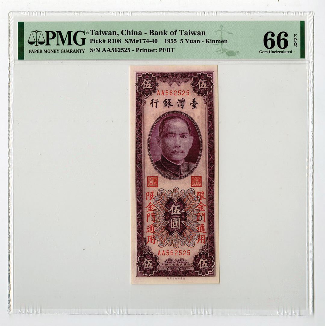 Taiwan. 1955. 5 Yuan - Kinmen, P-R108 S/M#T74-40, Issued banknote, Purple on face, S/N AA562525, PMG graded Gem Uncirculated 66 EPQ. Printer: PFBT.