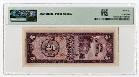 China/Taiwan, 1955. 5 Yuan, P-R108 S/M#T74-40, Issued Banknote, Purple on pink underprint in vertical format, SYS at top center, S/N AA562501, PMG graded Choice About Uncirculated 58 EPQ, PFBT.