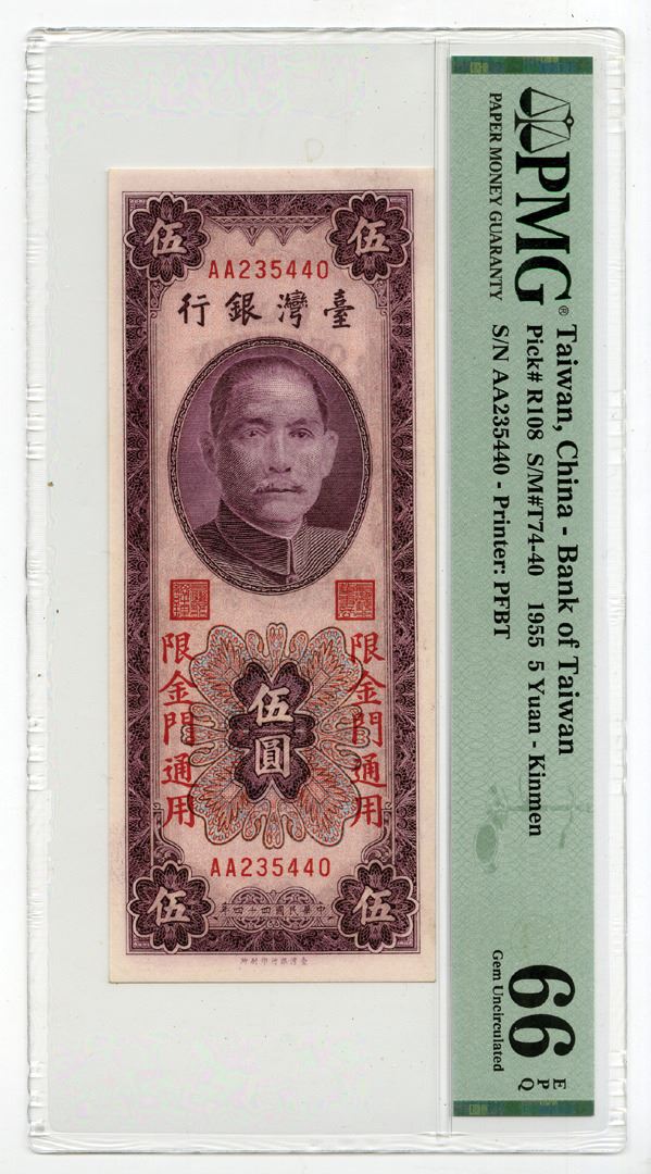 Taiwan, China, 5 Yuan, P-R108 S/M#T74-40, Kinman Branch, Issued Banknote, Note in vertical format, Purple on pink and m/c underprint with SYS at center, Bank building on back, S/N AA235440, PMG graded Gem Uncirculated 66 EPQ, PFBT.