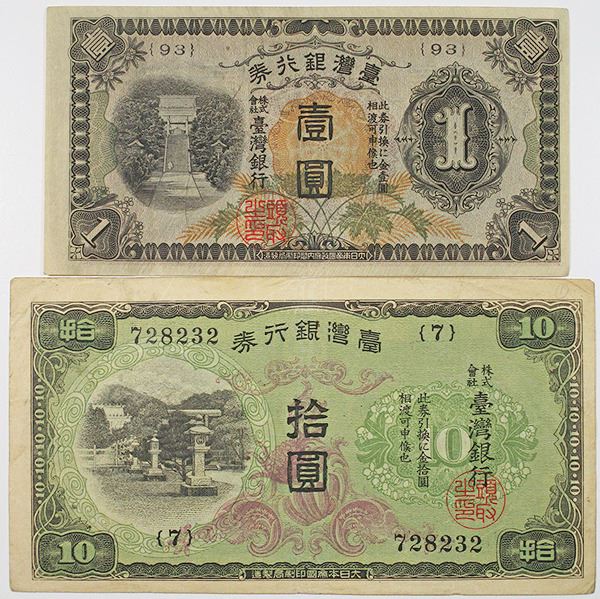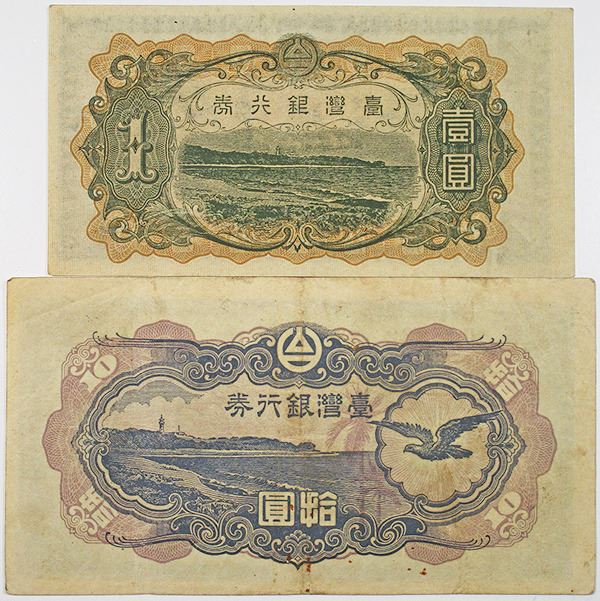 China - Taiwan. Lot includes a pair of 1 Yen and 10 Yen banknotes. P-1925; 1927. VF. (2)