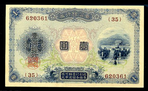 Taiwan, China, ND (1915), 1 Yen, P-1921, (S/M#T70-20), Block 35, Issued banknote, Blue on light pink and green underprint, temple at right, back dark green, lighthouse point and seascape, S/N 620361, PMG graded Choice Uncirculated 64 EPQ, the Finest Known out of 6 graded. A trophy for the discriminating collector who only wants the finest.