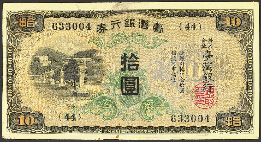 Taiwan, China, 1932, 10 Yen, P-1927a, (S/M#T70-32), Issued banknote, Black on green and light blue underprint, lanterns on road to Taiwan Jinja at left, Black and tan underprint, lighthouse point and seascape, S/N 633004, PMG graded Very Fine 30 NET with notation of minor rust. (From the Allen Berk Collection)