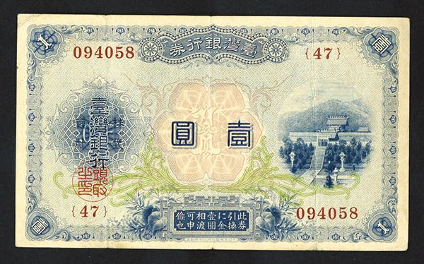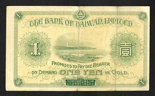Taiwan, issued 1 Yen in gold, P-1921, blue on lilac and light green underprint, temple and stairs at right. VF condition.