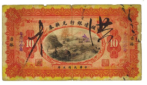 China. Dec. 1st, 1914, Kirin, $10, P-568f, S/M#C165-7d, Black on yellow and red border, back red, road building in middle, S/N K 0003720, unlisted overprint on back top margin "Payable by Ten Dimes to Each Dollar", Choice VG to Fine condition, BEPP.
