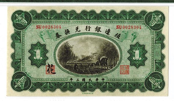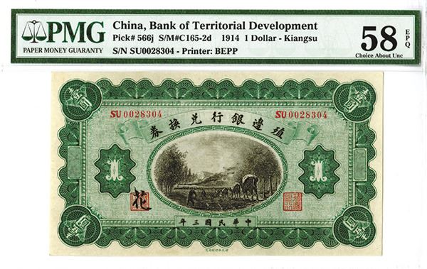 China. $1, Kiangsu. P-566j, S/M C165-2d. Black on green border, back green, S/N SU0028304, PMG graded Choice About Uncirculated 58 EPQ, Printer: BEPP. Scarce note in high grade.