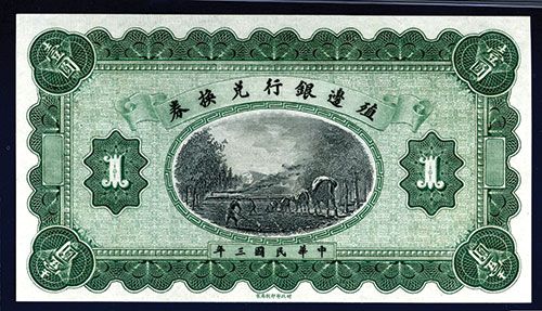China, 1914, $1, P-566r, (S/M#C165-1i), Remainder banknote, Black and green, Field workers and camel train at center, Without S/N, signatures or place name, PMG graded Gem Uncirculated 66 EPQ, lovely note that will be difficult to improve upon with only one graded higher by PMG.
