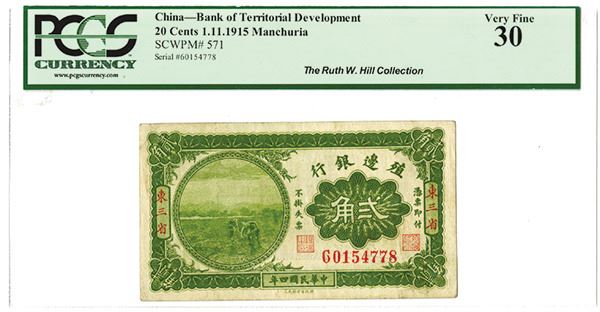 Manchuria, China, issued 20 Cents, P-571, PCGS Currency graded Very Fine 30. Ex-Ruth W. Hill Collection.