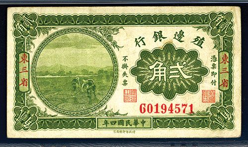 Manchuria, 1915, 20 cents, P-571 (S/M#C165-12), Issued banknote. Green with farm workers on left, back green, PMG graded Very Fine 25. Scarce note.