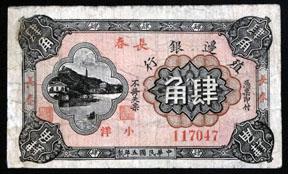 Changchun. 1916. 40 cents, P-580 issued banknote. Black on light red underprint, houses along shore. VG to VG+. Scarce note.