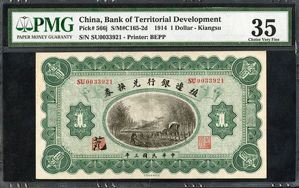 Kiangsu, China. $1, P-566j, S/M#C165-2d, Issued banknote, green and black with workers and camel in middle, back green, PMG graded Choice Very Fine 35 with bright colors, large even margins and sharp corners, rare branch issue. S/N SU 0033921, BEPP. (Alexander I. Pogrebetsky Family Archives, Part 2).