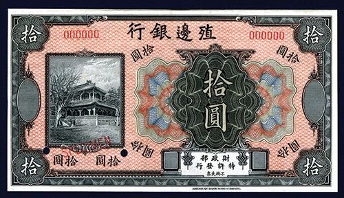 China, ND (1916), $10, P-584s, Unlisted Specimen, (S/M #C165-52?), Black on red and m/c, building at left, back purple, Red specimen overprints, “000000” serial numbers and POC's. Uncirculated condition. ABNC. Rare banknote as specimen.
