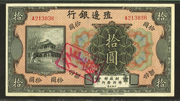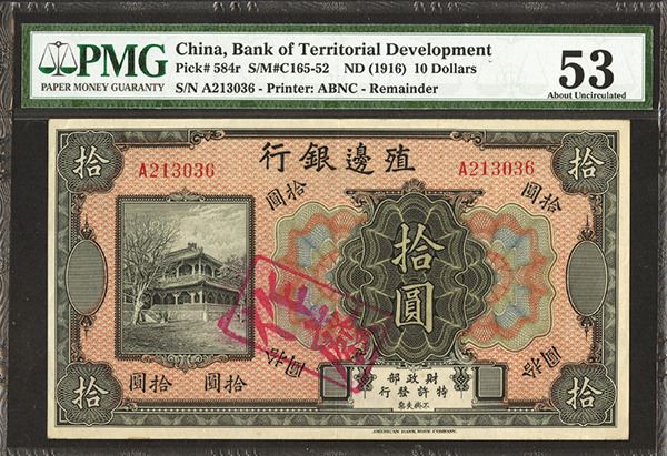 China, ND (1916), $10, P-584r S/M#C165-52, Remainder, Black on red and m/c, building at left, back purple, S/N A213036, PMG graded About Uncirculated 53 condition. ABNC.