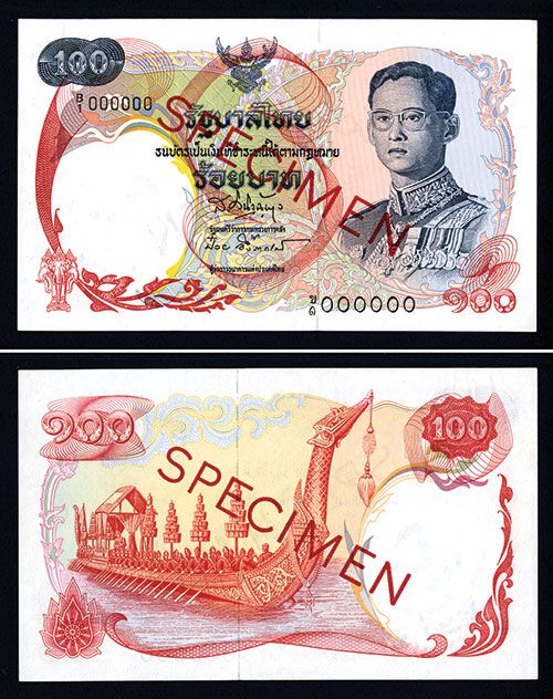ND (1968) Issue, 100 Baht, P-79s, Specimen banknote, Red, blue and m/c, Rama IX on right, Red Specimen overprint, S/N 000000, Choice AU to Uncirculated, attractive note rarely seen as specimen.